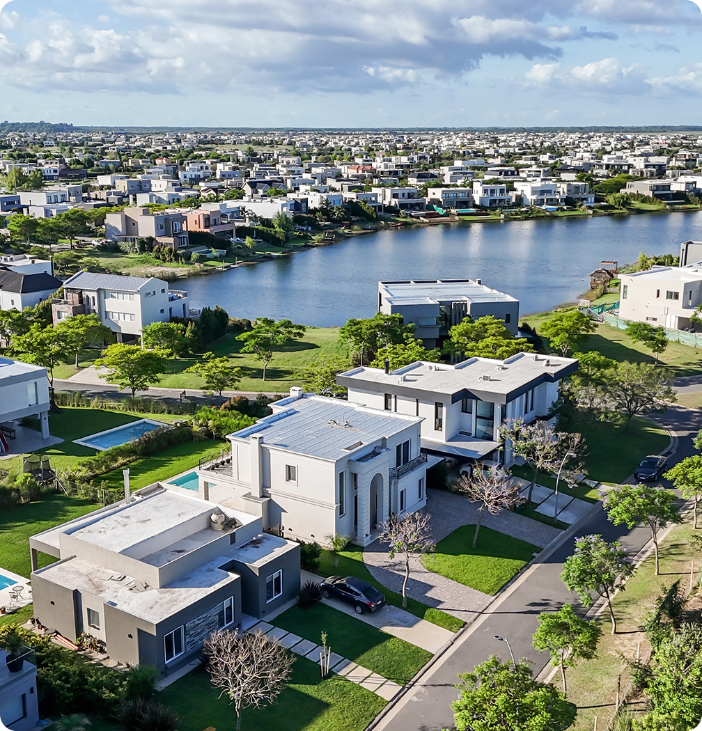 Puertos del lago, en Escobar, abarca 1400 hectáreas, con un gran lago central de 200 hectáreas y una reserva natural de 60 hectáreas. Se caracteriza por su diseño urbanístico y paisajístico, priorizando la conservación del medio ambiente y la calidad de vida de sus habitantes.